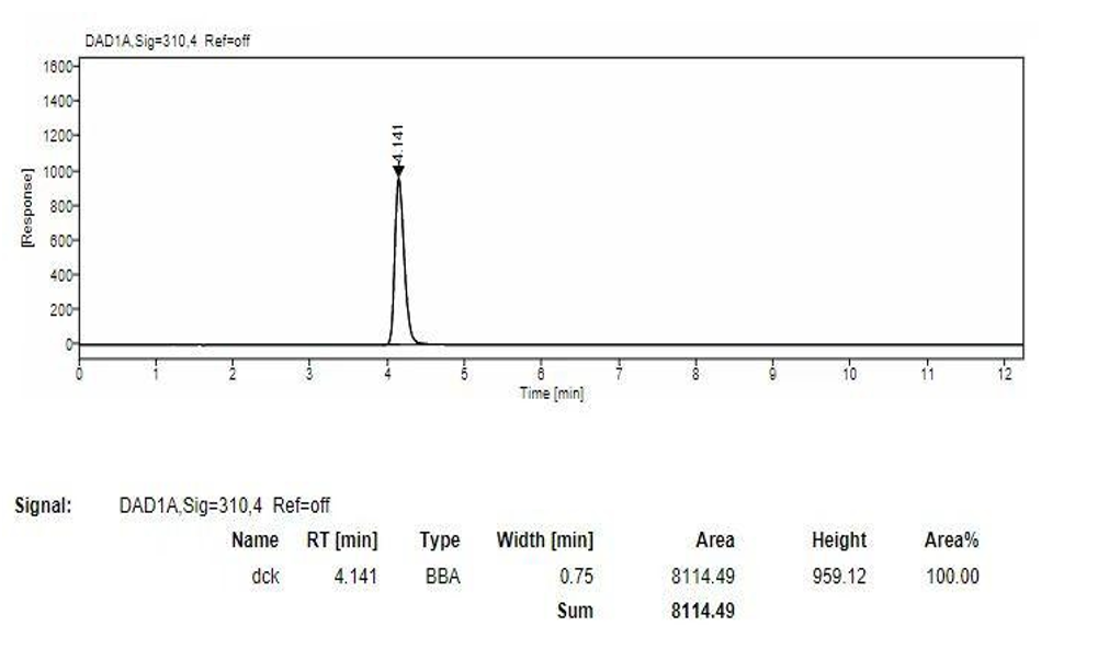 App ID: FLM-T240011 Titank C18 柱對敵草快二氯鹽、烯酰嗎啉、苯嘧磺草胺檢測 方法:CCPIA 團體標準 T/CCPIA 217—2023 色譜柱:Titank C18 5μm 150×4.6 mm (貨號:FMF-5560-EONU) 柱溫:25C° 流速:1ml/min 敵草二綠鹽: 流動相:乙腈:庚烷磺酸鈉=10:90 波長:310nm 色譜圖: