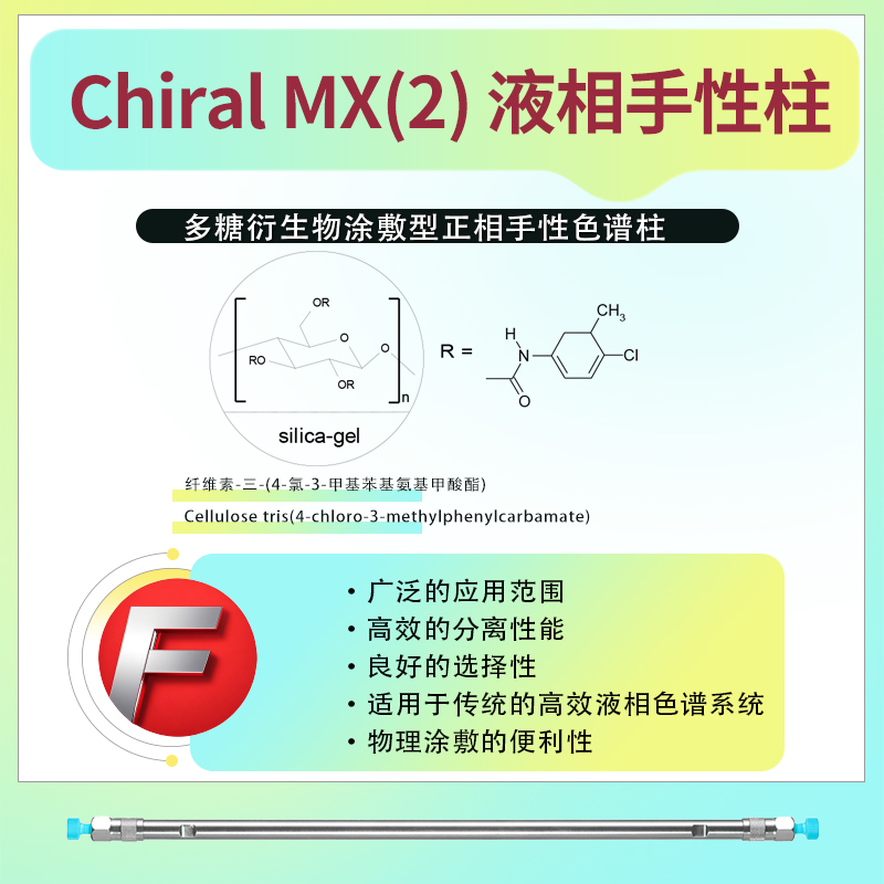 Chiral MX(2)-RH反相手性柱的固定相為纖維素-三-(4-氯-3-甲基苯基氨基甲酸酯)(Cellulose tris(4-chloro-3-methylphenylcarbamate))。這種固定相具有高效的手性識別能力,能夠對不同的光學異構體進行有效的分離。