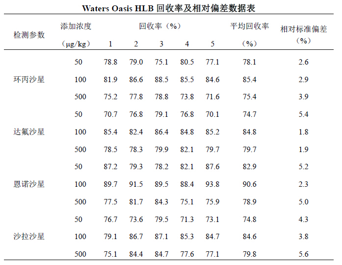 樣品按不同添加水平進(jìn)行試驗(yàn),每個(gè)水平 5 次重復(fù),計(jì)算回收率及批內(nèi)相對(duì)標(biāo)準(zhǔn)偏差。
