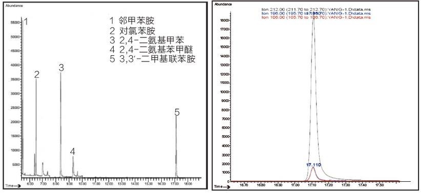 圖 1 部分禁用芳香胺總離子流圖 圖 2 3,3'-二甲基聯苯胺色譜圖